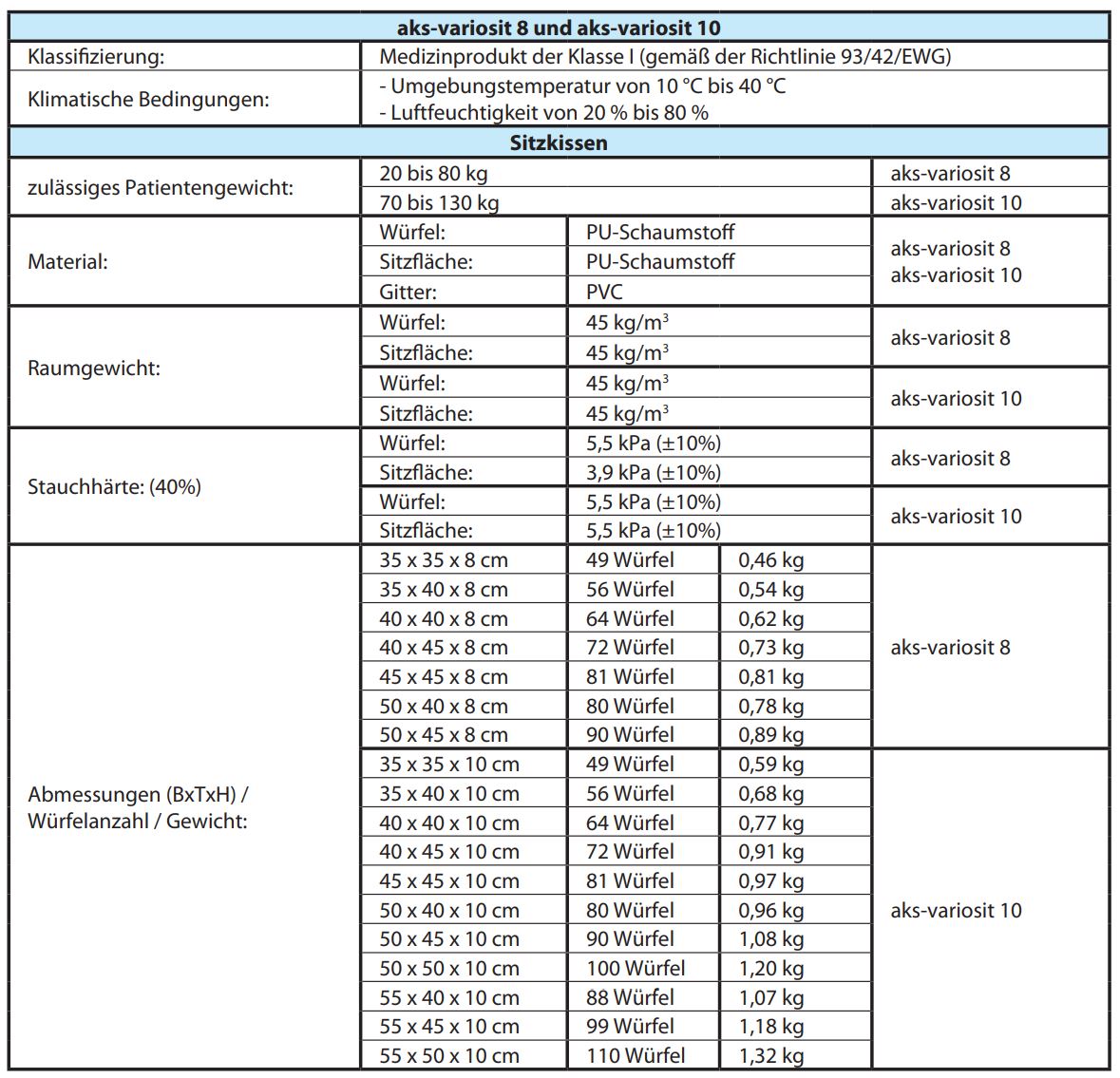 AKS Variosit 10 Würfelsitzkissen zur Dekubitusprophylaxe und -therapie zweischichtiges Schaumstoff-Würfelsitzkissen zur individuellen Versorgung im Rollstuhl Das AKS Variosit 10 zeichnet sich unter anderem durch folgende Merkmale aus: Die 5×5 cm großen Schaumstoffwürfel ermöglichen Ihnen aus einer Vielzahl von Sitzkissengrößen auszuwählen. Die innenliegenden Schaumstoffwürfel sind herausnehmbar und erlauben eine zusätzliche, gezielte Druckentlastung an besonders gefährdeten Körperbereichen, z.B. im Bereich der Sitzbeinhöcker. Die Anpassung der Sitzhaltung ist bei Patienten mit Körperfehlstellungen, z.B. Wirbelsäulenverkrümmung, Beckenschiefstand durch herausnehmbare Schaumstoffwürfel möglich. Das AKS-Variosit 10 ist mit dem wasserundurchlässigen inkoair®-Sitzkissenbezug erhältlich. Als Option ist ein Bezug aus 3D-Abstandsgewebe zur verbesserten Luftzirkulation erhältlich. Patientengewichte AKS Variosit 10, 70-130 kg Dekubitusprophylaxe und -therapieunterstützung bis Grad IV (nach EPUAP) Die Vorteile des AKS Variosit 10 AKS Variosit 10 besitzt eine Sitzfläche aus PU-Schaumstoff Schaumstoffwürfel von 5 x 5 cm Größe, ermöglichen eine vielseitige Anzahl an lieferbaren Sitzkissengrößen und somit eine individuelle Versorgung mit dem passenden Sitzkissen. zusätzliche Druckentlastung durch die gezielte Würfelentnahme auf der Unterseite (durch „Hohllagerung“) an besonders gefährdeten Gesäßbereichen, z. B. im Bereich der Sitzbeinhocker Die äußeren Würfel sind für den unterstützenden Sitzkomfort mit der oberen Schaumstoffschicht verbunden. Zur Stabilisierung der Würfel trägt ein Kunststoffgitter bei, zudem vereinfacht es die Würfelentnahme Inklusive wasserundurchlässigem inkoair®-Sitzkissenbezug zum Schutz des Sitzkissens z. B. bei Inkontinenz. Option aks-3D air-Sitzkissenbezug zur verbesserten Luftzirkulation Die bewährten aks-variosit Sitzkissen sind nicht nur in der Größe, sondern auch in ihren Leistungen gewachsen. Die Weiterentwicklung des Produktes bringt erhöhten Nutzen für den Anwender. Die Herausnahme der 5 x 5 cm großen Schaumstoffwürfel ermöglicht eine zusätzliche, gezielte Druckentlastung an besonders gefährdeten Körperbereichen und somit eine individuelle Versorgung. Die äußeren Würfel sind für den unterstützenden Sitzkomfort mit der oberen Schaumstoffschicht verbunden. Ferner trägt das eingesetzte Gitter zur Stabilisierung bei und vereinfacht die Handhabung der Würfelentnahme. Funktionsbeschreibung Das AKS Variosit ist ein Schaumstoffsitzkissen, welches in den zwei Ausführungen AKS Variosit 8 und AKS Variosit 10 erhältlich ist. Beide Varianten unterscheiden sich in der Schaumstoffkombinationund in der Sitzkissenhöhe. Sie sind in unterschiedlichen Abmessungen erhältlich. Durch diese Unterteilung und durch die unterschiedlichen Größenvarianten ist eine individuelle Versorgung derPatienten möglich. Die Basisschicht des aks-variosit besteht aus einzelnen Schaumstoffwürfeln mit einer jeweiligen Größe von ca. 5x5x6 cm, die in einem PVC-Gitter fixiert sind. Diese Schaumstoffwürfel-Struktur hat eine punktelastische Wirkung zur Folge und wirkt somit scherkraftmindernd und druckentlastend.Die innenliegenden Schaumstoffwürfel sind an der Kissenunterseite herausnehmbar, was zusätzlich eine punktuelle Druckentlastung in besonders gefährdeten Bereichen, z.B. im Bereich der Sitzbeinhöcker ermöglicht.Auf die Schaumstoffwürfel ist eine einteilige, glatte Schaumstoffschicht aufgebracht, die mit den äußeren Schaumstoffwürfelreihen verklebt ist. Diese dient als Sitzfläche und gewährleistet eine konturgenaue Anpassung an den Gesäßbereich des Patienten. Somit wird die Auflagefläche vergrößert und der Auflagedruck minimiert. Das Dekubitusrisiko wird verringert.Das aks-variosit ist mit einem abnehmbaren Inkontinenzsitzkissenbezug ausgestattet. Die mOberseite und somit die Sitzfläche besteht aus einem wasserundurchlässigen Polyestergewebe mit Polyurethanbeschichtung für Patienten mit Harn-/Stuhlinkontinenz. Die Unterseite besteht maus einem beschichtetem Polyestermaterial, welches Rutschhemmend wirkt. Dadurch wird einsicherer Halt des Sitzkissens auf der Sitzgelegenheit (Rollstuhl, Stuhl u.a.) ermöglicht. Als Option ist ein Sitzkissenbezug aus einem 3D-Abstandsgewebe erhältlich, dessen Struktur eine ausreichende mLuftzirkulation im Bereich des Gesäßes des Patienten gewährleistet. HMV-Nummer 11.39.01.3012 Indikation Das Antidekubitus-Schaumstoffsitzkissen aks-variosit ist sowohl für die Dekubitusprophylaxe als auch für die Dekubitustherapie einsetzbar. Für die Prophylaxe ist das Sitzkissen für die Versorgung von Patienten mit einem hohen Dekubitusrisiko (gemäß Braden-Skala) geeignet. Für die Therapie ist das Sitzkissen einsetzbar, wenn beim Patienten bereits Dekubitalulzera (Grad I bis IV nach EPUAP) vorliegen. Bei der Produktauswahl müssen die Funktionseigenschaften des Sitzkissens auf die Beeinträchtigungen und Funktionseinschränkungen des jeweiligen Patienten abgestimmt werden. Kontraindikationen Das Antidekubitus-Schaumstoffsitzkissen aks-variosit (aks-variosit 8/aks-variosit 10) ist nicht bei Patienten mit völlig fehlender Sitzstabilität einzusetzen. Wenn eine physiologisch unpassende Sitzsituation (z.B. Erschwerung der Bewegungen im Sitzen oder mangelnder Bodenkontakt der Beine) durch die Anwendung des Sitzkissens bewirkt wird, müssen adäquate Maßnahmen für eine physiologische Sitzhaltung getroffen werden. Anwendungsbereich Das aks-variosit ist ein Medizinprodukt der Klasse I, das zur Verhütung, Behandlung oder Linderung von Dekubitalgeschwüren bestimmt ist. Es ist für Patienten vorgesehen, bei denen aufgrund einer Krankheit oder Behinderung ein dauerhaftes Sitzen erforderlich ist und ein erhöhtes Dekubitusrisiko im Sitzen besteht. Das aks-variosit ist für den Einsatz im häuslichen Bereich sowie für den Einsatz in stationären Einrichtungen geeignet. Es ist für die Anwendung auf 