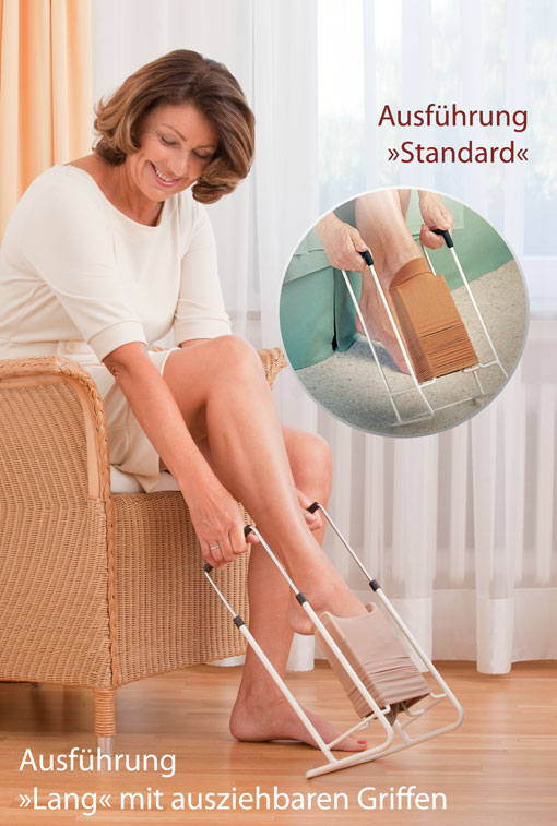 Die Anziehhilfe für Kompressionsstrümpfe von Russka Die Kompressionsstrümpfe können ohne Bücken und Strecken und ganz entspannt im Sitzen angezogen werden. Die bis auf 61 cm ausziehbaren Handgriffe erleichtern das Anziehen der Kompressionsstrümpfe. Die weiche Polsterung der Handgriffe sorgt für ein sicheres, angenehmes Halten während des Anziehens. Der anwenderfreundliche Winkel der Anziehhilfe erleichtert den Einstieg des Fußes in den Strumpf. Die Schaftweite beträgt 14 cm Die Handgriffe können ohne Montage wieder auf 41 cm Länge zurückgeschoben werden. Bei Nichtgebrauch oder für den Transport, z.B. auf Reisen kann das nützlich sein. Die Vorteile der Anziehhilfe für Kompressionsstrümpfe Die Anziehhilfe unterstüzt Personen mit eingeschränkter Beweglichkeit und Kraft beim oft sehr schwierigen Anziehen von engen Kompressionsstrümpfe. An den Handgriffen sorgt ein PU-Schaum für komfortables Halten und Hochziehen. Das expoxid-beschichtete Metall-Gestell der Anziehhilfe ist leicht im Gewicht, sowie auch kompakt in der Form. Die Oberfläche ist glatt und reibungsfrei. Erhältlich in vier Ausführungen: ”Standard” sowie Ausführung ”Weit”, die für stärkere Unterschenkel geeignet ist. Bei der Ausführung ”Lang” und ”Lang und Weit” können die Handgriffen bis auf 61 cm Länge herausgezogen werden. ”Lang und Weit” ist ebenfalls für stärkere Unterschenkel geeignet. Bitte lesen Sie vor Gebrauch dieses Anziehhilfe für Kompressionsstrümpfe von Russka aufmerksam die Bedienungsanleitung und halten Sie sich an die Anweisungen des Herstellers. Änderungen vorbehalten. Abbildungen können vom Original abweichen.