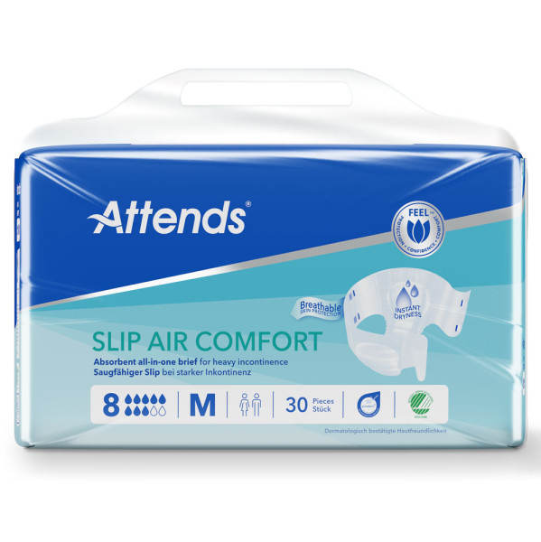 Die Attends Slip Air Comfort sind saugfähige Slips mit speziellen Saugkanälen für schnelle Flüssigkeitsaufnahme und Trockenheit. Sie eignen sich für starke Harn- und oder Stuhlinkontinenz.Nachfolger der Attends Slip Regulareinfaches Verschluss-System mit 4 Klebesreifen hält das Produkt sicher am Körper100% atmungsaktiv für Rundum-Tragekomfortfür Frauen und Männerfür längere Tragezeiten und als Nachversorgung geeignetNässeindikator zeigt an, wann das Produkt gewechselt werden mussSaugstärke:8 10 TropfenGröße M:Bauch Hüftumfang: 80 – 110 cmLieferumfang:1×30 Stück Attends Slip Air Comfort 8 M