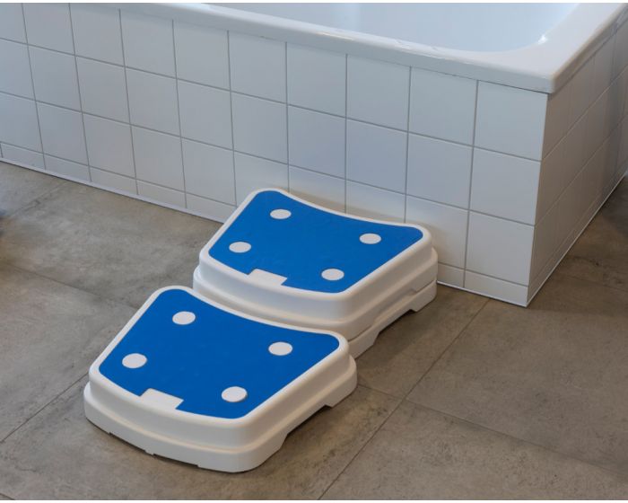 Badestufe stapelbar 3er-Set sicher Einsteigen in die Badewanne, je 10cm (gestapelt +5cm) Die Badestufe erleichtert das sichere Einsteigen in die bzw. aus der Badewanne. Sie fördert somit die Sicherheit und Eigenständigkeit. Die große Trittfläche von 42 x 31 cm unterstützt das sichere Gefühl beim Ein-und Ausstieg. Zahlreiche Gummifüße an der Unterseite sorgen für eine hohe Standsicherheit auf den Badezimmerfliesen. Die Stufe kann einzeln verwendet werden, aber sie sind auch übereinander gestapelt einsetzbar. Die Materialauswahl ist optimal für Nassräume geeignet. Dank der besonderen Textur ihrer blauen Trittauflage bietet die Badestufe auch mit nassen Füßen einen sicheren Halt. Dank des geringen Eigengewichts kann die Badestufe bei Nichtbedarf leicht transportiert und verstaut werden. Die Vorteile der Badestufe(n) stapelbares 3er-Set Erhöhung der einzelnen Stufe: 10 cm Erhöhung bei gestapelten Stufen: plus 5 cm sehr stabil und belastbar bis 190 kg auch für Kinder nutzbar (WC, Waschbecken) Bitte lesen Sie vor Gebrauch dieses Produkts aufmerksam die Bedienungsanleitung und halten Sie sich an die Anweisungen des Herstellers. Änderungen vorbehalten. Abbildungen können vom Original abweichen.