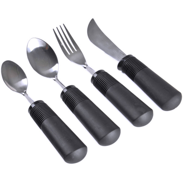 Das Big Grip Besteck ist biegsam. Es kann also in alle Richtungen gebogen werden, sodass es ideal für Senioren, bewegungseingeschränkte Personen und auch Kinder geeignet ist.Weicher Griff mit Riffeln verhindert AbrutschenSpülmaschinenfestGriff aus Gummi, Besteckteil aus EdelstahlLänge Griff: je ca. 12,7 cmHierbei handelt es sich um das 4-teilige Set, bestehend aus:Gabel, Esslöffel, Teelöffel und MesserLieferumfang:1 Stück Big Grip Set biegsam