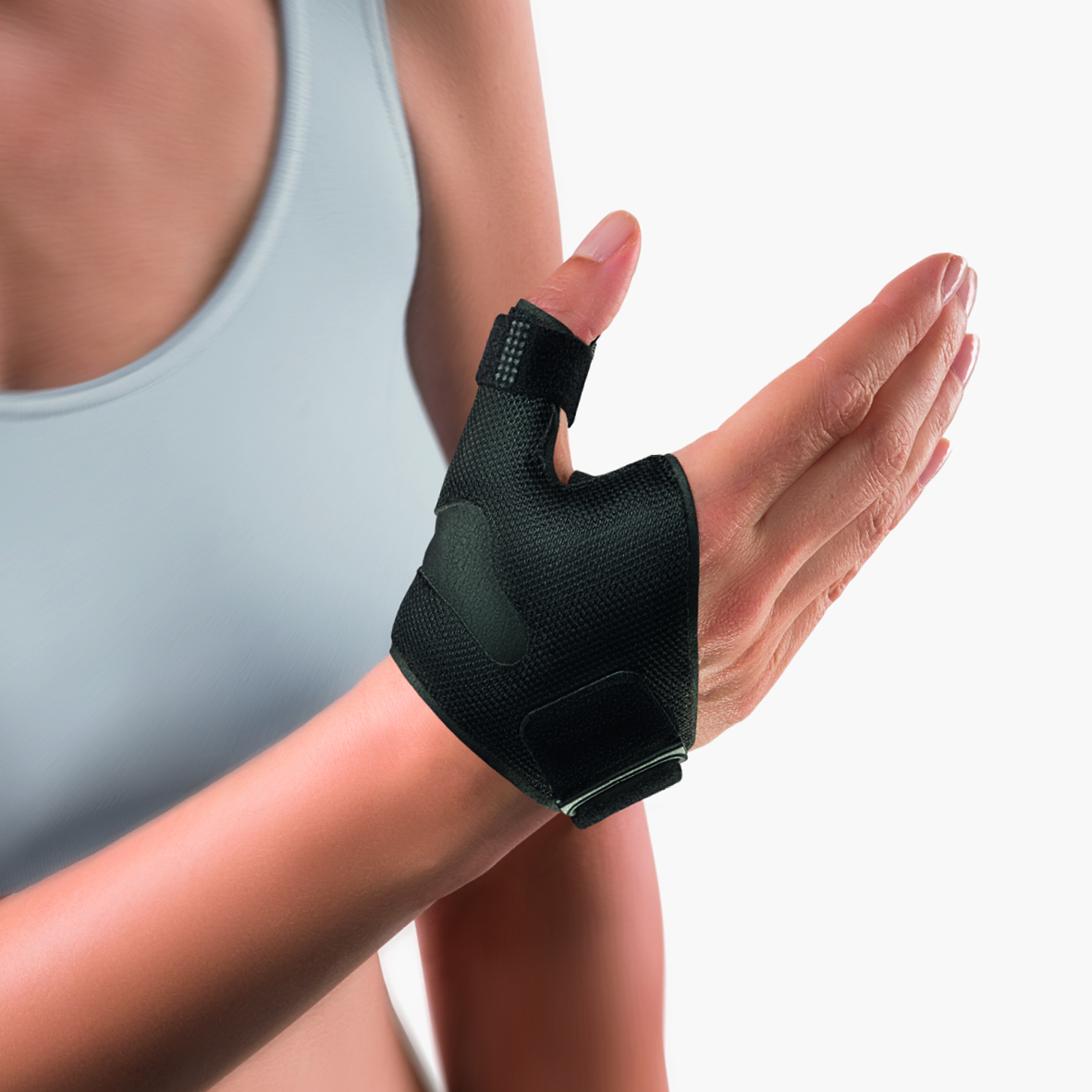 Bort SellaFix N Edition Black Mittelhand-Daumen-Schiene perforiertes Kunststoff mit Heißluftfön anpassbar innenseite vollflächig beflockt schwarze Schiene mit Schaumstoffpolster freie Beweglichkeit des Handgelenks Klettverschluss individuell anbringbare Polsterstreifen Indikation Zur Ruhigstellung des Daumengrund- und Sattelgelenks nach ulnarer Bandläsion Teilimmobilisation Rhizarthrose Kontraindikation Großflächige Verletzungen der Haut Lymphödem Überempfindlichkeit gegen eines der verwendeten Materialien. Die Vorteile der Bort SellaFix N Edition Black Mittelhand-Daumen-Schiene Ruhigstellung ist ein Grundprinzip bei der Behandlung von Verletzungen und Überbelastungen, da die Gesundungsprozesse wesentlich beschleunigt werden. Die Perforation sorgt für bessere Ventilation und gewährleistet so einen hohen Tragekomfort. Die Orthese ist wasserunempfindlich und pflegeleicht. Die BORT SellaFix® Daumen-Orthesen sind aus thermoplastischem Material gefertigt. Der eingelegte Polsterstreifen ist abnehmbar und kann beliebig neu positioniert werden. Achtung! Temperaturen über 40°C (z.B. heißes Wasser, Fahrzeuge, Sauna) vermeiden. Bitte lesen Sie vor Gebrauch diesen Bort SellaFix N Mittelhand- Daumen-Schieneaufmerksam die Bedienungsanleitung und halten Sie sich an die Anweisungen des Herstellers. Änderungen vorbehalten. Abbildungen können vom Original abweichen.