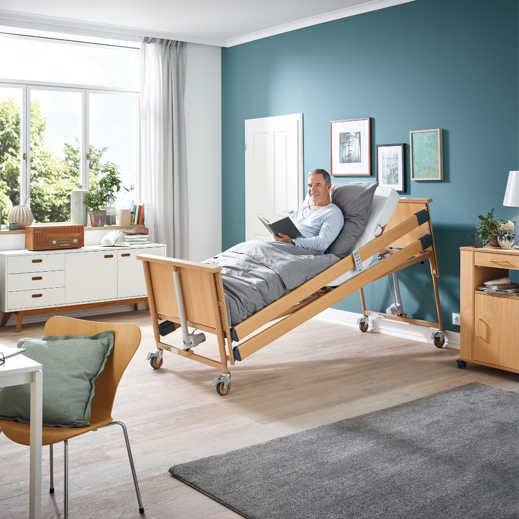 Burmeier Pflegebett Dali 100, 100cm Breite, mit Kabelbedienung, 24V, Holzumrandung, Holzliegefläche, bis 185kg Arbeitslast