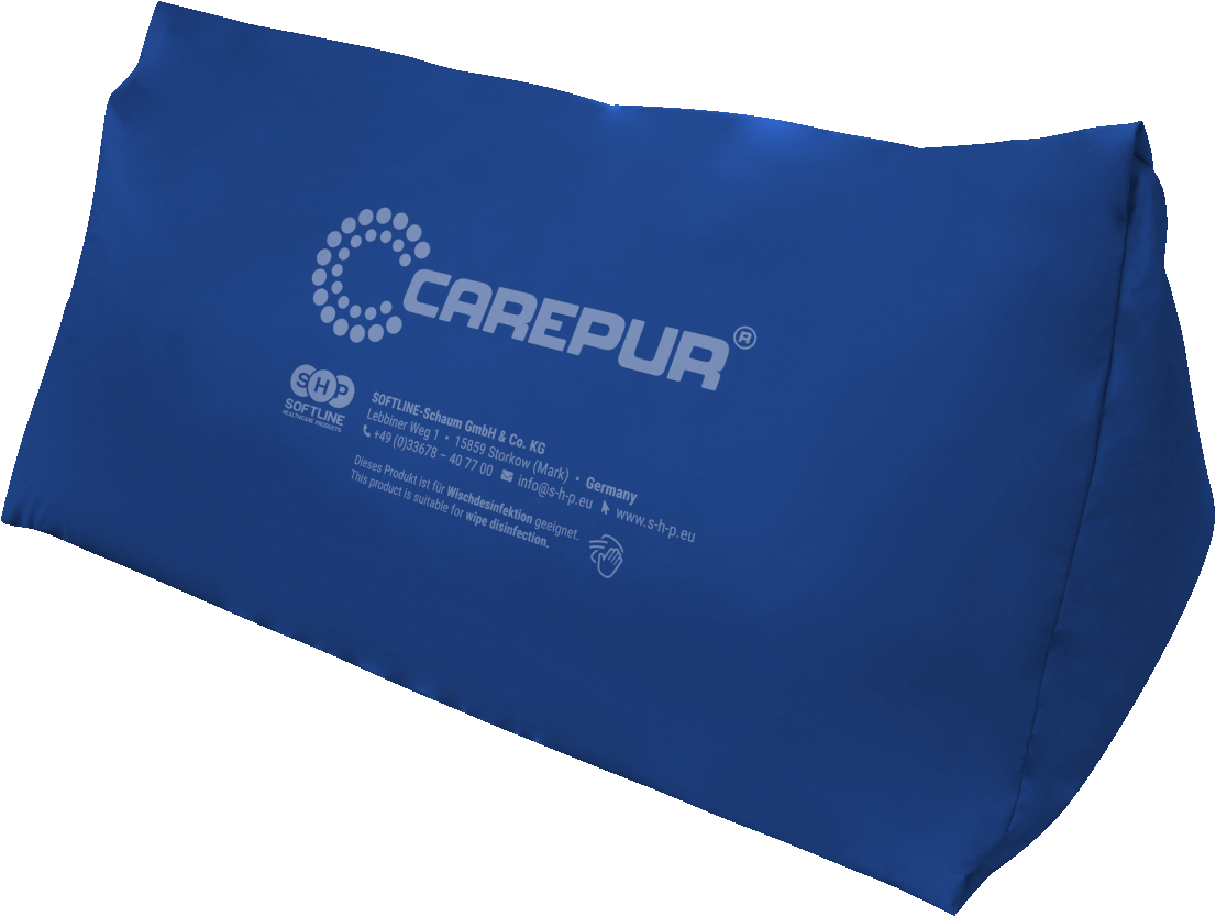 CAREPUR Deltakissen M blau, 60 x 41 cm Lagerungskissen für eine optimale Anpassung und Lagerung in der Kniebeuge vielfache Einsatzmöglichkeiten Das Deltakissen wurde konzipiert, um den Thorax des Patienten abzustützen mit PU-Bezug sorgt für eine hervorragende Anpassung und Lagerung in der Kniebeuge des Patienten Die Vorteile des CAREPUR Deltakissen Das Deltakissen wurde konzipiert, um den Thorax des Patienten abzustützen Das Kissen kann sowohl in der 30° Seitenlage als auch in der 135° Lagerung eingesetzt werden Krankenkassen-Hilfsmittelnummer HMV 11.11.05.1013 Dieses Kissen überzeugt durch seine trianguläre und sorgt damit für eine hervorragende Anpassung und Lagerung in der Kniebeuge des Patienten Multifunktionale Deltakissen in der 30° Lagerung Das Deltakissen eignet sich aufgrund seiner triangulären Form gut zur thorakalen Abstützung bei der 30°-Seitenlagerung… …und… und der 135°-Lagerung. Deltakissen in Rückenlage Die trianguläre Form des Deltakissens bewirkt die Unterfütterung der Knie, die erhöhte Führung der Oberschenkel und entspannt so die Bauchdecke. Kombination Deltakissen in der Rückenlage Die Anwendungskombination von Semi-Fowler-Kissen und Deltakissen ermöglicht ebenfalls eine effiziente Spitzfußprophylaxe durch Positionierung. Allgemeine Indikation CAREPUR-Lagerungskissen sind Medizinprodukte der Klasse I. Sie sind als statische Positionierungshilfen für Leib, Rumpf und Extremitäten sowohl für die Dekubitusprophylaxe als auch für die Dekubitustherapieunterstützung geeignet. Sie wirken nach dem Weichlagerungs-, Umlagerungs- bzw. Freilagerungsprinzip und unterstützen je nach Kissentyp bei der Lagerung und Positionierung besonders gefährdeter Körperteile bzw. Körperregionen. Die Produkte können eine manuelle Lagerung des Patienten nicht ersetzen, aber gegebenenfalls das Lagerungsintervall verlängern bzw. die korrekte Lagerung und Positionierung erst ermöglichen. Spezielle Indikation | Merkmale Das CAREPUR Deltakissen bietet aufgrund seiner triangulären Form multifunktionale Einsatzmöglichkeiten: beispielsweise wird es zur thorakalen Abstützung bei der 30°-Seitenlagerung und der 135°-Lagerung eingesetzt. Dabei ermöglicht es eine gute Entlastung des Oberkörpers und gleichzeitig ein entspanntes Liegen. Weiterhin ist es zur Lagerungsunterstützung der Kniebeuge in Rückenlage, zur Durchführung der Spitzfußprophylaxe oder zur Weichlagerung einzelner Extremitäten geeignet. Anwendungsbereich | Funktion Die CAREPUR -Lagerungskissen sind für den Einsatz in Krankenhäusern, Alten- und Pflegeheimen sowie im häuslichen Bereich geeignet und dienen der Verbesserung der Positionierung im Standardbett, Pflegebett bzw. im Rollstuhl und zur Unterstützung bei der Durchführung spezifischer Lagerungsformen zur Prophylaxe und Therapie von Dekubitalgeschwüren. Durch das leichte Einsinken des Patienten in die Kissenstruktur kann sich der Auflagedruck auf eine wesentlich größere Fläche verteilen, wodurch eine scherkraftreduzierende Wirkung und die gleichzeitige Verbesserung der Blutzirkulation der angrenzenden Gewebeareale erreicht werden. Die Kissen sind geeignet zur Verwendung in Betten mit ebener oder verstellbarer Liegefläche und für den Einsatz in trockenenRäumen. Hinweis: Für den Betreiber/Anwender von Medizinprodukten ist die Medizinprodukte-Betreiber-Verordnung (MPBetreibV) verbindlich. Der Anwender muss die entsprechende Sachkenntnis besitzen, um die Eignung des Produktes zu prüfen und das bestehende Dekubitusrisiko sowie vorhandene Dekubitalulzerationen beurteilen zu können. Anwendungsrisiken| Kontraindikation Erfolgt die Verwendung der CAREPUR -Lagerungskissen in Betten mit Seitengittern, ist ein Einklemmen der Kissen in die Seitengitter zu verhindern, um einen eventuellen Funktionsverlust der Seitengitter und somit eine Patientengefährdung zu vermeiden. Bei stark transpirierenden Personen kann es bei der Anwendung zu einer partiellen Mazeration des angrenzenden Gewebes kommen. In diesem Fall empfehlen wir die zusätzliche Verwendung des Ersatzbezuges Lenzing FR®. Dieser neuartige Bezug mit integriertemFlammschutz vereint den Inkontinenzschutz mit einer hautfreundlichen, textilen Oberfläche. Bitte lesen Sie vor Gebrauch dieses CAREPUR Deltakissen aufmerksam die Bedienungsanleitung und halten Sie sich an die Anweisungen des Herstellers. Änderungen vorbehalten. Abbildungen können vom Original abweichen.