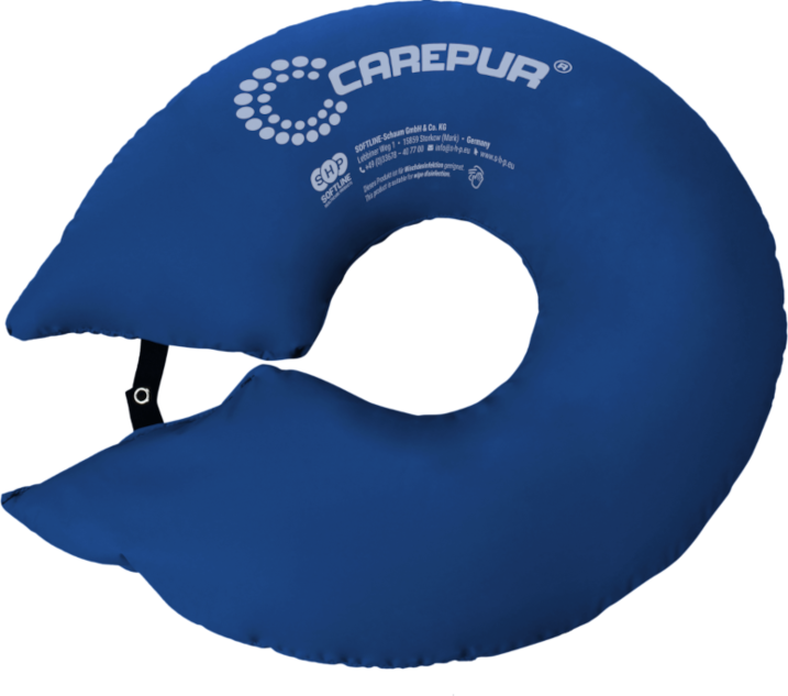 CAREPUR Ringkissen M blau, 132 x 21 cm zur optimalen Kopflagerung vielfache Einsatzmöglichkeiten speziell für das pflegende Personen entwickelt mit PU-Bezug Lagerungskissen anerkanntes Hilfsmittel gegen Dekubitus HMV 11.11.05.0013 Die Vorteile des CAREPUR Ringkissen Es ist ein ringförmiges Kissen mit einer Öffnung, die mittels eines Druckknopfs verschlossen werden kann. Es dient der Weichlagerung und Stabilisierung des Kopfes und der angrenzenden Halspartie. Der Kopf wird sicher positioniert, so dass die Pflegeperson beide Hände zur Bewegungsförderung des Patienten einsetzen kann. Die hauptsächliche Anwendung des CAREPUR Ringkissens erfolgt in der Rücken- oder Seitenlage bzw. im Sitzen des Patienten/Bewohners, wobei das Kissen um den Hals des Anwenders gelegt und mittels Druckknopf verschlossen und so fixiert wird. Es kann ebenfalls zur Unterfütterung der Unterschenkel und Freilagerung der Fersen oder bei Platzierung unter den Oberschenkeln mit der offenen Seite des Kissens in Richtung Kopf zur Entlastung des Sakralbereiches durch partielle Freilagerung angewendet werden. Ringkissen in Rückenlage In der Rückenlage wird der Kopf so positioniert, dass sich die Halswirbelsäule in Mittelstellung/Neutralstellung befindet, der Hals aufliegt und unterstützt wird. Ringkissen in der 30°-Lagerung Der Kopf sollte in Seitenlage so positioniert sein, dass sich die Wirbelsäule im Bereich der unteren Halswirbelsäule in Neutralstellung befindet. Ringkissen in der 135°-Lagerung Wenn der Kopf durch das Ringkissen sicher positioniert ist, kann sich der Pflegende mit beiden Händen der Bewegungsförderung des Patienten/Bewohners widmen. Allgemeine Indikation CAREPUR-Lagerungskissen sind Medizinprodukte der Klasse I. Sie sind als statische Positionierungshilfen für Leib, Rumpf und Extremitäten sowohl für die Dekubitusprophylaxe als auch für die Dekubitustherapieunterstützung geeignet. Sie wirken nach dem Weichlagerungs-, Umlagerungs- bzw. Freilagerungsprinzip und unterstützen je nach Kissentyp bei der Lagerung und Positionierung besonders gefährdeter Körperteile bzw. Körperregionen. Die Produkte können eine manuelle Lagerung des Patienten nicht ersetzen, aber gegebenenfalls das Lagerungsintervall verlängern bzw. die korrekte Lagerung und Positionierung erst ermöglichen. • Spezielle Indikation | Merkmale Das CAREPUR Ringkissen dient der Lagerung und Stabilisierung des Kopfes und der angrenzenden Halspartie in Rücken- oder Seitenlage. Der Kopf wird sicher positioniert, so dass die Pflegeperson beide Hände zur Bewegungsförderung des Patienten einsetzen kann. Durch die Mikropolystyrol-Füllung formt sich das Kissen bequem an die anatomischen Strukturen an und entlastet die Hals- und Nackenmuskulatur sicher. • Anwendungsbereich | Funktion Die CAREPUR-Lagerungskissen sind für den Einsatz in Krankenhäusern, Alten- und Pflegeheimen sowie im häuslichen Bereich geeignet und dienen der Verbesserung der Positionierung im Standardbett, Pflegebett bzw. im Rollstuhl und zur Unterstützung bei der Durchführung spezifischer Lagerungsformen zur Prophylaxe und Therapie von Dekubitalgeschwüren. Durch das leichte Einsinken des Patienten in die Kissenstruktur kann sich der Auflagedruck auf eine wesentlich größere Fläche verteilen, wodurch eine scherkraftreduzierende Wirkung und die gleichzeitigeVerbesserung der Blutzirkulation der angrenzenden Gewebeareale erreicht werden. Die Kissen sind geeignet zur Verwendung in Betten mit ebener oder verstellbarer Liegefläche und für den Einsatz in trockenen Räumen. Hinweis: Für den Betreiber/Anwender von Medizinprodukten ist die Medizinprodukte-Betreiber-Verordnung (MPBetreibV) verbindlich. Der Anwender muss die entsprechende Sachkenntnis besitzen, um die Eignung des Produktes zu prüfen und das bestehende Dekubitusrisiko sowie vorhandene Dekubitalulzerationen beurteilen zu können. • Anwendungsrisiken | Kontraindikation Erfolgt die Verwendung der CAREPUR-Lagerungskissen in Betten mit Seitengittern, ist ein Einklemmen der Kissen in die Seitengitter zu verhindern, um einen eventuellen Funktionsverlust der Seitengitter und somit eine Patientengefährdung zu vermeiden. Bei stark transpirierenden Personen kann es bei der Anwendung zu einer partiellen Mazeration des angrenzenden Gewebes kommen. In diesem Fall empfehlen wir die zusätzliche Verwendung des Ersatzbezuges Lenzing FR®. Dieser neuartige Bezug mit integriertem Flammschutz vereint den Inkontinenzschutz mit einer hautfreundlichen, textilen Oberfläche. Material | Pflege und Reinigung Die Lagerungskissen bestehen zu 100 % aus Polystyrolkugeln mit kleiner Granulierung und sind mit einem Bezug aus bi-elastischem Polyamidgewebe (45 %) mit antibakterieller Polyurethanbeschichtung (55 %) versehen. Sie sind somit flüssigkeits-, bakterien-, milben- und virendicht, atmungsaktiv, abwaschbar, wischdesinfizierbar sowie beständig gegen Blut, Urin, Salben, Öle und Fette. Bei Verschmutzung kann die Reinigung der Kissen mit warmem Seifenwasser erfolgen. Die Desinfektion sollte ausschließlich mit chlorfreien Mitteln erfolgen, die durch dasRobert Koch-Institut (RKI) oder den Verbund für Angewandte Hygiene e. V. (VAH) geprüft und zugelassen sind. Die Gebrauchshinweise der verwendeten Reinigungs- und Desinfektionsmittel sind unbedingt zu beachten. Der Ersatzbezug ist in einer Waschmaschine mit handelsüblichen Waschmitteln bis 95 °C waschbar und bei niedriger Temperatur trocknergeeignet. Die Herstellung der CAREPUR-Lagerungskissen unterliegt höchsten Qualitätsnormen. Damit sich die vom Hersteller angegebenen Eigenschaften nicht verändern, beachten Sie hierzu die Merkblätter Allgemeine Reinigungs- und Pflegehinweise zu SHP-Produkten/Wiedereinsatz von SHPProdukten und Reinigung und Pflege von SHP-Produkten. Diese stehen auf unserer Internetpräsenz zum Download für Sie bereit. Positionierungs-Ratgeber (ca. 2,5 MB) Bitte lesen Sie vor Gebrauch dieses CAREPUR Ringkissen aufmerksam die Bedienungsanlei