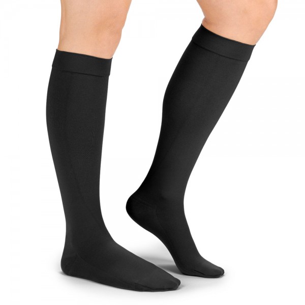 Die Compressana Leganza Kompressionsstrümpfe sind besonders elegant und haben einen hohen Tragekomfort. Das Maschenbild ist gleichförmig und fein, sodass sich die Kniestrümpfe sehr weich auf der Haut anfühlen und eine glatte Oberfläche haben.Dezente TransparenzAnatomischer Schnitt und vorteilhafte Betonung der BeinformHervorragendes DehnungsverhaltenWeicher, dehnfähiger und einschnürungsfreier KniebereichNahtfreier, stricktechnisch umgehängter Rippbund als SoftrandKomplett verstärkte Sohlenpartie ohne Einschränkung der LängselastizitätGroßzügige, luftige, nicht einengende Fußspitze mit weicher DehnungKlima-, temperatur- und feuchtigkeitsregulierende EigenschaftenPflegeleicht, waschmaschinen- und trocknergeeignetGeschlossene FußspitzeFarben:perlegraphitschwarzsilksandelchocoindigoweißFußlänge:ca. 22,5 – 27,5 cmbis Schuhgröße 44Beinlänge kurz:34 – 39 cmGröße (Fesselumfang):18 – 20 cm = I20 – 22 cm = II22 – 24,5 cm = III24,5 – 27 cm = IV27 – 30 cm = V30 – 33 cm = VIMaterial:57% Polyamid43% ElasthanLieferumfang:1 Paar Compressana Leganza kurz Kompressionsstrümpfe AD CCL2 in gewählter Größe und Farbe