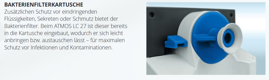 Bakterienfilterkartusche (10er Pack) für Atmos LC27 Homecaresauger, Saugschlauch Bitte lesen Sie vor Gebrauch der DDS-Bakterienfilterkartusche aufmerksam die Bedienungsanleitung und halten Sie sich an die Anweisungen des Herstellers. Änderungen vorbehalten. Abbildungen können vom Original abweichen.