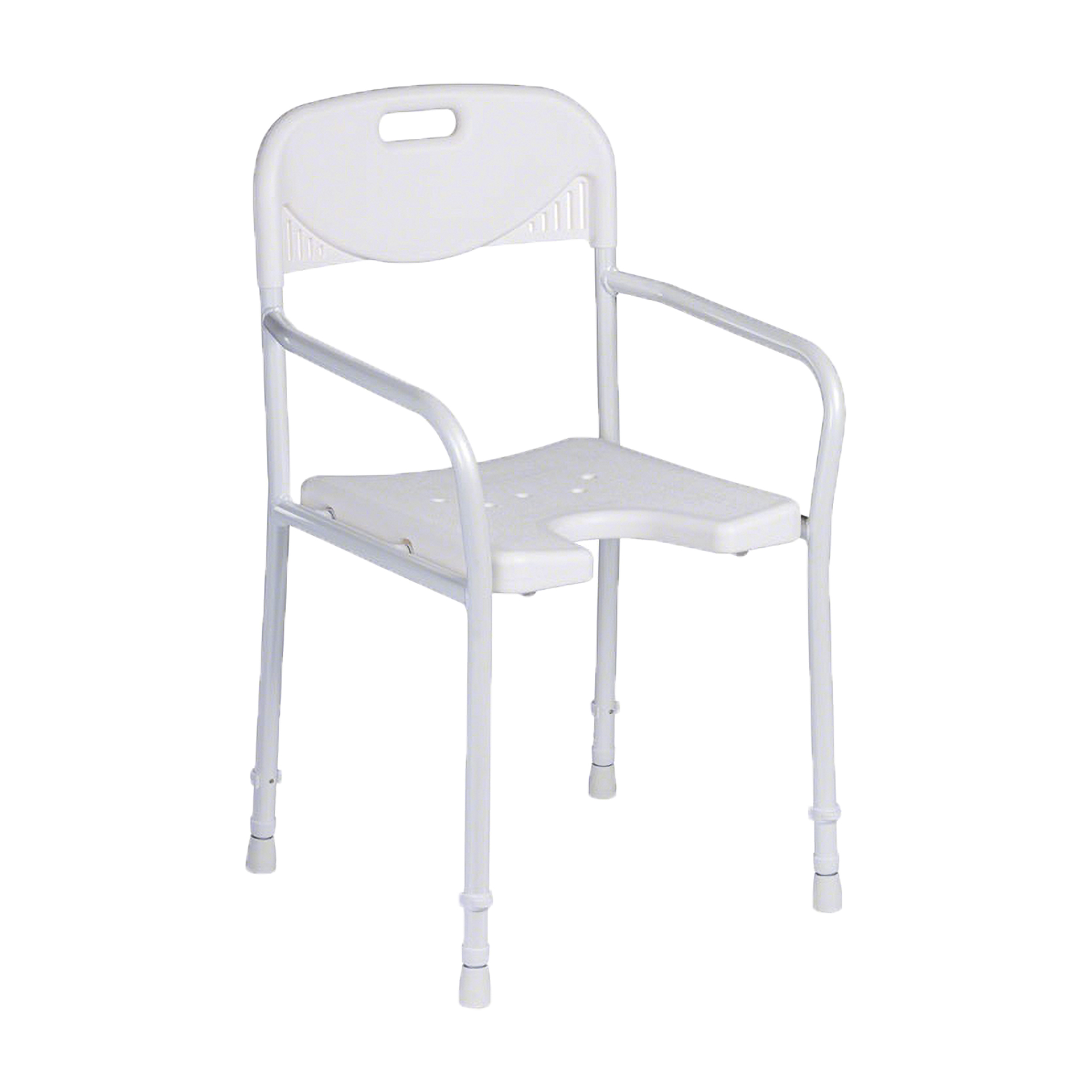 Dietz 9401 A Duschstuhl mit Armlehnen und Rückenlehne bis 120kg belastbar pulverbeschichteter Aluminiumrahmen Standfüße 4-fach höhenverstellbar, mit Gummikappen Sitzfläche mit Intimausschnitt individuelle Anpassung hohe Stabilität problemlose Reinigung
