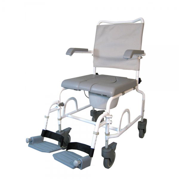 Der Dusch-Toilettenrollstuhl DuoMotion ist ein Multitalent mit Vollausstattung. Der Serienmäßige Softsitz ist nach vorne offen, sodass eine optimale Zugänglichkeit für den Benutzer möglich ist. Abdeckung der Hygieneaussparung ist im Lieferumfang enthalten Mit wenigen Handgriffen kann die Sitzhöhe 4-fach zwischen 50-57,5 cm verändert werden Der abdeckbare Eimer kann von hinten entnommen werden Die leichten und wendigen Kunststoffrollen mit Doppelstopp-Feststeller sorgen für Komfort und Sicherheit Der Rahmen aus pulverbeschichtetem Aluminium ist einfach zu reinigen und erfüllt höchsten Qualitätsanspruch Die hochklappbaren und strukturierten Fußstützen mit Fersenband sind 6-fach in der Länge einstellbar und sorgen für einen sicheren Halt Der maschinenwaschbare und weiche Rücken mit Schnellverschlüssen kann optimal auf den Nutzer eingestellt werden Die hochklappbaren Armlehnen erleichtern den Transfer 24″ Antriebsräder sind als Nachrüstset erhältlich Technische Daten: Gesamtbreite: 545 mm Sitzhöhe: 500-575 mm Sitztiefe: 410 mm Sitzbreite: 440 mm Höhe Rückenlehne: 430 mm Länge mit ohne Fußstützen: 980 680 mm Gewicht: 14 kg Max. Belastbarkeit: 130 kg