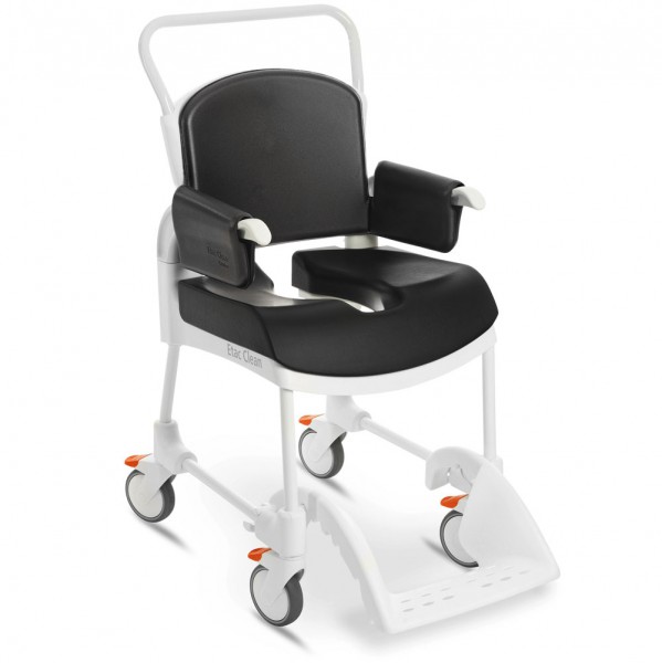 Der Etac Clean Dusch- und Toilettenrollstuhl Standard Comfort hat weiche, wärmereflektierende Komfortpolster. Die Polster schützen Gesäß, Rücken und Arme hervorragend gegen Druckstellen und wärmen zugleich. Die ergonomisch geformte Sitzauflage in Verbindung mit den wasserabweisenden Oberflächen aller Polster sorgt für hohe Sicherheit beim Sitzen und Aufstehen.In der reinen Schiebeversion ist der Etac Clean mit vier kleinen arretierbaren Rädern ausgestattet. Der Sitz ist nach hinten offen, so dass für Benutzer und Pflegepersonal eine optimale Zugänglichkeit möglich ist.Die Armlehnen können zur Seite geschwenkt oder auch ganz abgenommen werden. Die in der Höhe verstellbare Fußplatte lässt sich komplett unter den Sitz schieben, so dass ein Hinsetzen auf den Stuhl wesentlich erleichtert wird. Darüber hinaus ist für den Clean umfangreiches Zubehör erhältlich.Der CLEAN eignet sich für wand- und bodenmontierte Toiletten.Farbe:weiß mit grauen PolsternMaße:Gesamtbreite: 52 cmBreite zwischen den Armlehnen: 41 cmSitzhöhe: 49 cm (mit Polster 54 cm) oder 55 cm (mit Polster 60 cm)Sitzbreite: 50 cmSitztiefe: 44 cmHöhe bis Sitz ohne Beckenhalter: 43,5 cm oder 49,5 cmHöhe bis Sitz mit Beckenhalter: 42 cm oder 48 cmMaße Öffnung: 36,9 cm x 18,2 cm (T x B)Gewicht: ca. 14 kg Max. Belastbarkeit: 130 kgMaterialGestell: Pulverbeschichteter StahlRücken, Sitz, Armlehnen, Fußplatte: PolypropylenRadbefestigung: Polyamid TPE (arretierbar, kugelgelagert)Waschanleitung:Lösungsmittelfreies Reinigungsmittel mit einem pH-Wert zwischen 5 und 9Desinfektion mit 70% AlkoholKann bei Bedarf bei 85°C gereinigt werdenLieferumfang:1 Stück Etac Clean Dusch- und Toilettenrollstuhl Standard Comfort