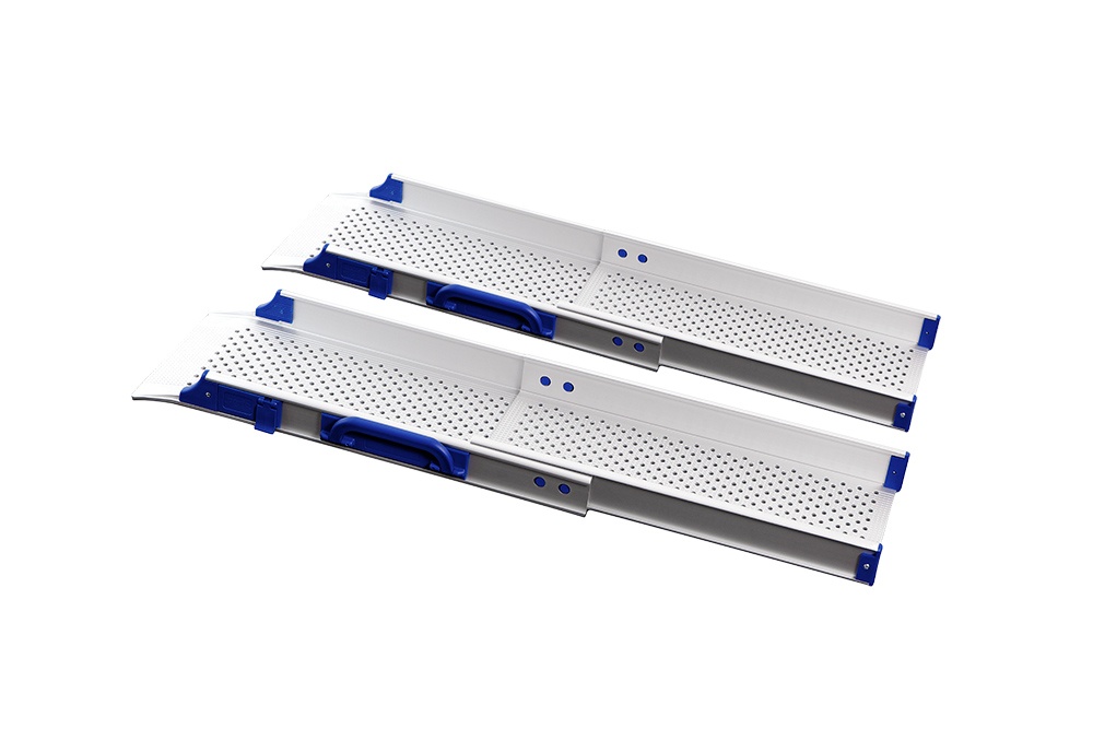 Perfolight Teleskoprampe 58 – 91cm Paar für Kanten oder Stufen bis zu 20cm Abfahrflächen mit Antirutsch-Beschichtung an der Unterseite an den Abfahrflächen sind die Seitenprofile abgeflacht Fahrbreite 19cm Transportsicherung Klemmschutz bei den Teleskoprampen bieten Ihnen Sicherheit und einfache Handhabung leichtgängiges Ineinanderschieben durch Gleiter zwischen den Rampen-Teilenaus Aluminium mit Handgriff belastbar bis 200kg pro Stück (400kg pro Paar) Die Vorteile der Perfolight Rampe teleskopierbar 58-91cm Qualität und Langlebigkeit bei geringem Gewicht sind die Kennzeichen dieser Rampen-Serie. Der schwedische Hersteller legt großen Wert darauf – doch auch für seine Innovationskraft ist FEAL bekannt Einzigartigkeit beweist Ihnen z.B. die Laufflächen-Perforierung, um etwa sieben Prozent kann das Gewicht reduziert werden, ohne Stabilität oder Belastbarkeit einzubüßen. Die Löcher sparen nicht nur Gewicht, sie dienen zudem der Drainage, Erhebungen zwischen den Löchern geben der Lauffläche Profil – für Rutschsicherheit beim Be- fahren oder Begehen und damit Sie sich immer sicher fühlen. Die Rampen sind aus Aluminium, und trotz der Perforierung sind sie bis zu 200kg belastbar (pro Stück). Eine Transportsicherung, Abfahrflächen mit einer Antirutsch-Beschichtung an der Unterseite und der Klemmschutz bei den Teleskoprampen bieten Ihnen Sicherheit und einfache Handhabung. TeleskoprampeExtras der Perfolight Teleskoprampe Lauffläche mit Perforierung Rutschsicher – auch bei Nässe und Feuchtigkeit. Durch die Löcher kann Wasser abfließen Transportsicherung Ein stabiler Stift dient als Sicherheits- verriegelung für den Transport Bitte beachten Sie vor Gebrauch der FEAL Perfolight Teleskoprampe 58 – 91cm aufmerksam die Anweisungen des Herstellers. Änderungen vorbehalten. Abbildungen können vom Original abweichen.