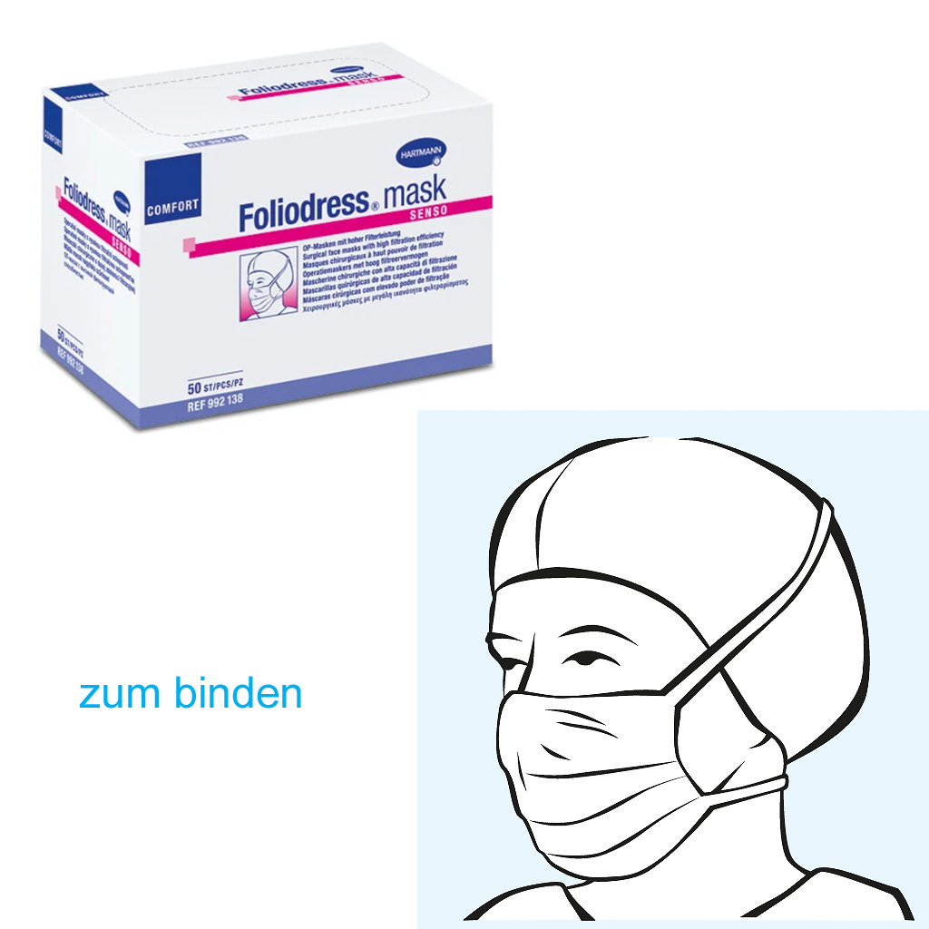 Foliodress® Mask Comfort Senso (grün) OP-Masken mit hoher Filterleistung, zum binden In einer besonders weichen und leichten Materialkombination mit ultraschallverschweißten Bändern für sehr sensible Haut Inhalt: 50 Stück Die Vorteile der Foliodress® Mask Comfort Chirurgische Gesichtsmasken aus hypoallergenen, besonders weichen und geschmeidigen Vliesstoffen, naturlatexfrei mit speziellem Micro-Keimfilter für freies Atmen bei optimaler Filterleistung mit langem, integriertem Nasenbügel geruchsneutral und strapazierfähig Bitte lesen Sie vor Gebrauch der Foliodress® Mask Comfort aufmerksam die Bedienungsanleitung und halten Sie sich an die Anweisungen des Herstellers. Änderungen vorbehalten. Abbildungen können vom Original abweichen.