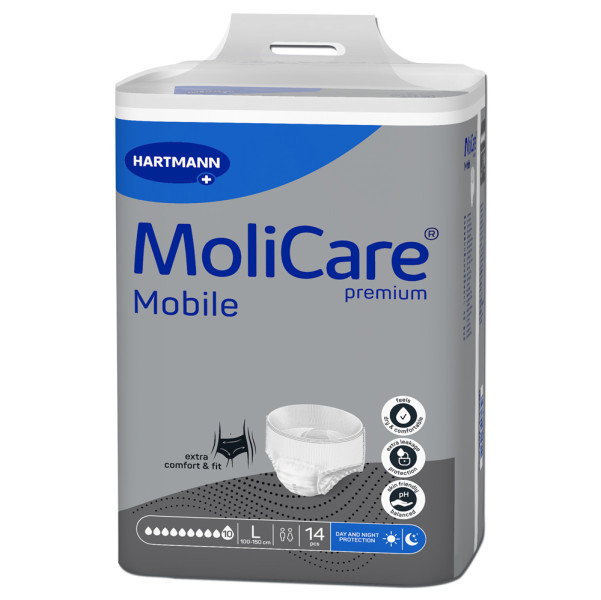Die Hartmann MoliCare® Premium Mobile sind Inkontinenzslips, die sich wie normale Unterwäsche tragen lassen.Das Nachfolgermodell ist noch sicherer, diskreter und schneller:Verbesserter Auslaufschutz und KomfortDünner und niedrigerer BundMit MoliCare SkinGuard® Saugkörpertechnologie für ein Sofort-Trocken-Gefühl und HautgesundheitSaugstärke:10 10Bauch- Hüftumfang:100 – 150 cm = Größe LLieferumfang:1×14 Stück Hartmann MoliCare® Premium Mobile 10 Tropfen L