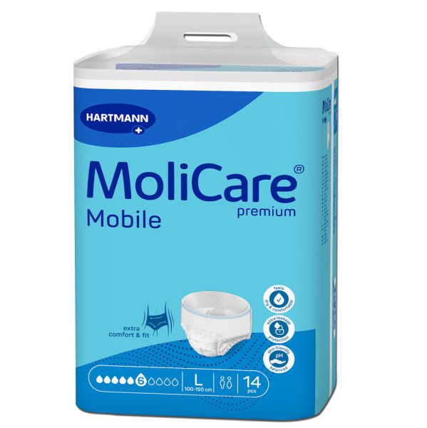 Die Hartmann MoliCare® Premium Mobile sind Inkontinenzslips, die sich wie normale Unterwäsche tragen lassen.Das Nachfolgermodell ist noch sicherer, diskreter und schneller:Verbesserter Auslaufschutz und KomfortDünner und niedrigerer BundMit MoliCare SkinGuard® Saugkörpertechnologie für ein Sofort-Trocken-Gefühl und HautgesundheitSaugstärke:6 10Bauch- Hüftumfang:100 – 150 cm = Größe LLieferumfang:1×14 Stück Hartmann MoliCare® Premium Mobile 6 Tropfen L
