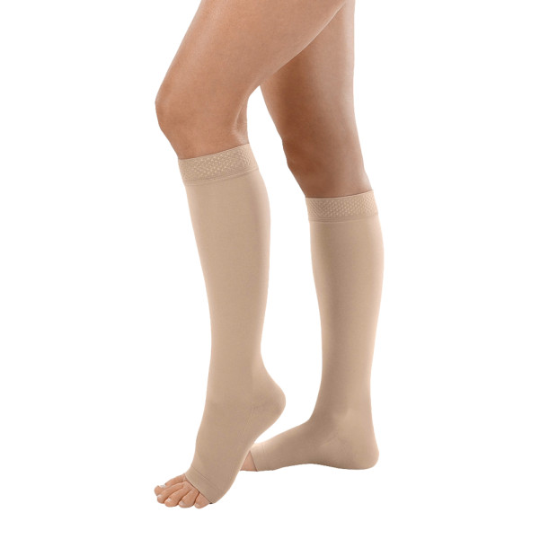 Die Juzo Inspiration Kompressions Kniestrümpfe haben eine transparente Feinstrumpf-Optik. Der leichte Venenstrumpf hat ein feines Maschenbild und kombiniert damit wunderbar einen modernen Look mit funktioneller Kompressionswirkung.Leicht formendOptimaler Halt durch hochwertige ElasthanfädenAtmungsaktives GestrickSchmaler Gestrickabschluss und verkleinerte Ferse für eine dezente OptikLanglebig dank durchgängig verstärkter FußsohleOhne Silikone und WeichmacherHandgefertigte Nähte für höchsten TragekomfortAnatomische PassformOffene FußspitzeMaterialzusammensetzung:65% Polyamid35% ElasthanFarben:ZuckerSesamMandelZimtKakaoMohnBlaubeerePfefferNormale Länge:40 – 46 cmGröße (Fesselumfang):18 – 20 cm = I20 – 22 cm = II22 – 24,5 cm = III24,5 – 27 cm = IV27 – 30 cm = V30 – 33 cm = VILieferumfang:1 Paar Juzo Inspiration AD CCL1 Kompressionsstrümpfe offene Fußspitze in gewählter Größe und Farbe