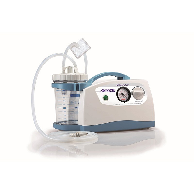Medutek KATASPIR 20 Absaugpumpe zur Anwendung bei HNO, Home-Care, Krankenstation, Tracheotomie Die Vorteile des Kataspir 20 Absauggerät KATASPIR 20 Sekretsauger wird zur nasalen, oralen oder trachealen Absaugung von Sekreten bei Erwachsenen und Kindern eingesetzt. KATASPIR 20 eignet sich speziell für Patienten mit Tracheotomie, bei kleineren chirurgischen Eingriffen sowie der postoperativen Therapie. Die Anwendung kann in der ambulanten und stationären Pflege, Altenpflege und im privaten Bereich erfolgen. Hilfsmittelpositionsnummer: 01.24.01.0022 PZN: 07021695 Aufgrund des geringen Gewichtes, der Sicherheitseinrichtungen und der einfachen Bedienung ist dieses Gerät auch für den privaten Bereich geeignet. Die Saugleistung kann manuell reguliert werden. Die Höhe des Vakuums ist je nach den Bedürfnissen des Anwenders mit dem Vakuumregler stufenlos bis maximal – 0,75 bar einstellbar. Das Vakuum ist über das eingebaute Manometer leicht ablesbar und ermöglicht die permanente Anpassung durch diese Regulierung. Zwischen der Vakuum-Pumpe und dem Sekretbehälter ist ein hydrophobischer Bakterienfilter eingesetzt, der die geräteseitige Kontamination zuverlässig verhindert. Der Filter ist leicht austauschbar. Das Gerät ist mit einem durchsichtigen autoklavierbaren Sekretbehälter ausgestattet. Der herausnehmbare Behälter hat ein Volumen von 1 Liter und ist gegen Umkippen fest gesichert. Der Füllstand des Behälters ist während des Absaugvorganges jederzeit sichtbar. Das Gerät ist gegen eine Übersaugung durch das Überlaufventil gesichert. Bei Erreichen der max. Sekretmenge sorgt das automatische Überlaufventil für die sichere Unterbrechung des Absaugvorganges. Alle Teile, die mit Körperflüssigkeiten in Berührung kommen können, sind leicht zu reinigen und wieder aufzubereiten. Der Betrieb des tragbaren KATASPIR 20 Absauggerätes erfolgt über das Netz 230V~. Die Vakuumpumpe und andere Komponenten befinden sich in einem schlagfesten Kunststoffgehäuse. Anleitung