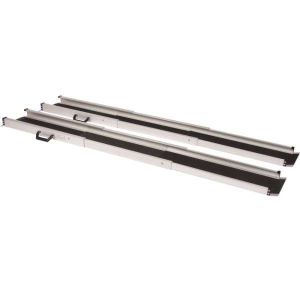 Die Mobilex Teleskoprampe TR aus Aluminium ist mit einem rutschfestem Friktionsbelag beschichtet. Sie besteht aus zwei getrennten Auffahr-Schienen mit jeweils 3 Segmenten, die mit einer Arretierung versehen sind, um ein unbeabsichtigtes Ein- und Ausfahren der Segmente zu verhindern. Größen (bitte als Länge auswählen): Breite (pro Schiene): ca. 26 cm Laufflächen Breite: ca. 19 cm Höhe Radabweiser (Seitenabweiser): 7 5 cm Max. Belastbarkeit: 225 kg TR-150 TR-210 TR-300 Länge 150 cm 210 cm 300 cm Max. Steigung Höhe 12° 30 cm 12° 40 cm 12° 60 cm Gewicht 2 x 5,5 kg 2 x 7,5 kg 2 x 9,5 kg Faltmaße (LxBxH) 74×26,5×7 cm 95×26,5×7 cm 125×26,5×7 cm Lieferumfang: 1 Stück Mobilex Teleskoprampe TR in gewählter Länge