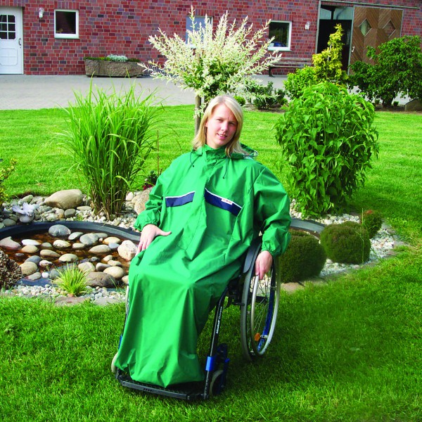 Mit dem Orgaterm Regencape Multifunktional aus leichtem Nylon sollten Sie sicher gegen Regen und Wind geschützt sein. Es eignet sich für Standard- Elektrorollstühle und Scooter. Die Kapuze mit beidseitigem Sichtfenster lässt sich durch einen Reißverschluss leicht abnehmen.  Im Rückenbereich wurde eine Tasche eingefügt. Diese ist normalerweise nach Innen eingenäht, lässt sich aber bei Bedarf nach Außen stülpen und schützt so die Kopfstütze ebenfalls vor Nässe. Ein drittes mittig angebrachtes Klettband ermöglicht es das Regencape zu öffnen, so dass bei starren langen Kopfstützenstangen Mensch und Rollstuhl bestens vor Wettereinflüssen geschützt sein sollten. Das Regencape wird in Handarbeit gefertigt, sodass beim Nähen kleine Löcher entstehen können. Das heißt, dass es bei sehr starkem Regen, wasserdurchlässig ist und demnach nicht 100% wasserdicht ist. Dies bitten wir zu beachten! Ein Verschweißen der Nähte ist leider nicht möglich. ungefüttert mit Arm abnehmbare Kapuze Maße: Junior 3: Vorderteilbreite: 51 cm Rückenhöhe: 54 cm Ärmellänge: 68 cm Fußtiefe: 18 cm Vordere Gesamtlänge: 140 cm Senior 4: Vorderteilbreite: 54 cm Rückenhöhe: 57 cm Ärmellänge: 72 cm Fußtiefe: 22 cm Vordere Gesamtlänge: 155 cm XXL 5: Vorderteilbreite: 60 cm Rückenhöhe: 63 cm Ärmellänge: 72 cm Fußtiefe: 22 cm Vordere Gesamtlänge: 170 cm Farben: grün rot aquablau schwarz marine pink gelb anthrazit Lieferumfang: 1 Orgaterm Regencape multifunktional in der gewählten Farbe