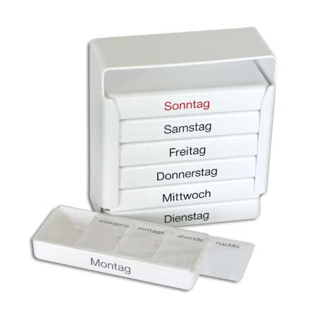 Russka Medikamentendispenser Medi 7 sortiert Tabletten für eine Woche Medikamentendispenser jeweils mit Wochentag beschriftet 7 Tagesdosierer Die Vorteile des Russka Medikamentendispenser Medi 7 Die Tagesdosierer werden hintereinander in der Spenderkassette aufbewahrt und im Rotationssystem am vorderen Ende der Kassette herausgezogen und nach Gebrauch am hinteren Ende wieder eingesetzt mit 7 einzelnen Tagesdosiereren mit Wochentagen beschriftet praktisch für unterwegs jeweils mit 4 Zeitintervallen Bitte lesen Sie vor Gebrauch dieses Russka Medikamentendispenser Medi 7 aufmerksam die Bedienungsanleitung und halten Sie sich an die Anweisungen des Herstellers. Änderungen vorbehalten. Abbildungen können vom Original abweichen.