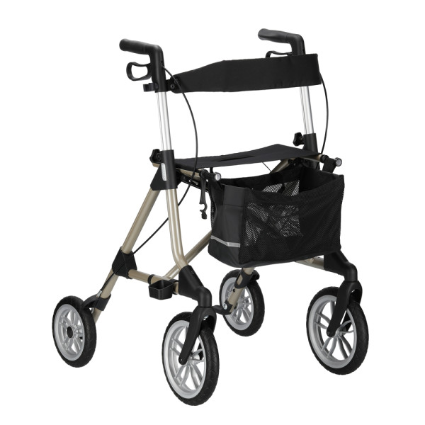 Der Russka Rollator Elan Tour hat extra große Vorderräder und insgesamt weiche, strukturierte Räder, sodass er ideal auf unebenem Untergrund genutzt werden kann. Die Stöße werden abgefedert und er kann bestens auch auf Feldwegen oder Kopfsteinpflaster eingesetzt werden. Zudem hat er eine schlichte Eleganz, ist leicht manövrierbar und hat eine breite Standfläche für extra Sicherheit.Praktisch faltbar mit VerrieglungMit Rückengurt, Stufenhilfen und StockhalterMit ReflektorenNummerierte Höhenverstellung (zum Wiederfinden der richtigen Griffhöhe)Maße:Sitzhöhe (Größe): 60 cmBreite: 60,5 cmLänge: 67,1 cmHandgriffhöhe: 77 – 96,5 cmFaltmaß: 70 x 18 x 84 cm (L x B x H)Räder vorne: Durchmesser 25 cmRäder hinten: Durchmesser 20 cmAbstand zwischen den Schiebegriffen: 46 cmGewicht: 7,14 kg (ohne Zubehör)Gewicht Zubehör: Tasche 200 g, Rückengurt 120 g, Stockhalter 40 gMax. Belastbarkeit: 150 kgMax. Belastbarkeit Tasche: 5 kgMaterial:Rahmen: AluminiumReifen: PolyurethanTasche: 100% PolyesterFarben:champagneranthrazit dunkelrotLieferumfang:1 Stück Russka Rollator Elan TourInkl. Rückengurt, Stufenhilfen, Stockhalter und Tasche
