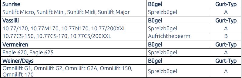 SLK Universalgurt Gr. M Universalgurt für den allgemeinen Gebrauch max. Patentengewicht: 320 kg für den sicheren Transfer des Patienten sowie das Liften vom Boden möglich auch für Lifter anderer Hersteller geeignet Kompatibilitätsliste (GURT A) Auszug aus der Erklärung: Mit dieser Kompatibilitätserklärung bestätigt die SLK Vertriebsgesellschaft mbH, dass die durch sie vertriebenen Gurte mit allen nachstehend aufgeführten mobilen Patientenliftern -Aktivlifter/Universallifter- und Deckenlifter anderer Hersteller verwendet werden können, die mit einem hängenden System mit offenen oder geschlossenen Haken ausgestattet sind. Diese Hakenmüssen in der Lage sein, eine 50 mm breite Gurtschlaufe aufzunehmen und unter Zug zu halten. Der Lifter muss mit einem 2-, 3-, 4- oder 8-Punkt-Lifterbügel ausgestattet sein. Systeme mit gelochten Metall- oder Kunststoffösen sind nicht kompatibel.