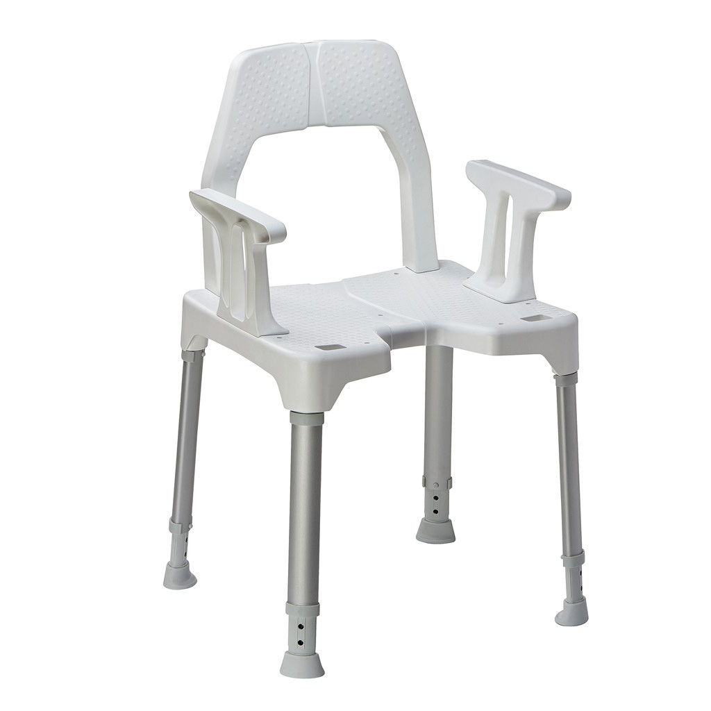 TAYO Duschstuhl mit Rückenlehne und Armlehnen, HMV, weiß, Hygieneausschnitt vorne/hinten möglich, bis 130kg