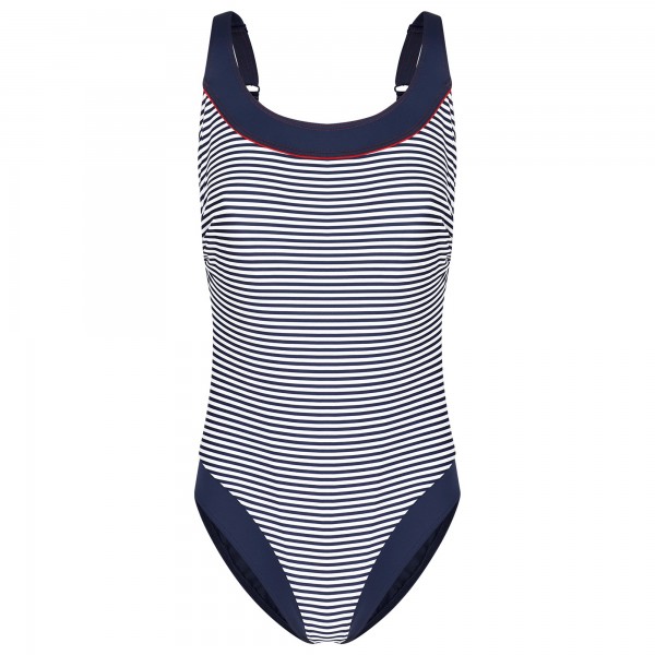In diesem eleganten Silima Badeanzug Marseille im Marine-Look machen Sie am Strand oder im Schwimmbad eine gute Figur.Höheres Dekolleté – sorgt für sicheren Sitz und zuverlässige NarbenabdeckungHöherer Schnitt im Unterarm – optimiert Sitzkomfort des BadeanzugsEingearbeitete tiefe Taschen – verhindern Herausfallen oder -schwimmen der EpitheseKorsage aus Lycratüll – optimiert Figur und gibt HaltHoher Rückenausschnitt – gewährleistet besseren Halt der TrägerWeiche Cup-Schalen im Körbchen – passen sich natürlich anBadeanzug mit eingearbeiteter Halbkorsage im VorderteilTräger verstellbarMaterial:Druck: 80 % Polyamid, 20 % ElasthanUni: 80 % Polyamid, 20 % Elasthan (Xtra Life)Elasthan Xtra Life: Sehr gute Farb- und Formbeständigkeit, hoher Tragekomfort, schnelltrocknend, hohe Chlorresistenz, geringe Wasseraufnahme, pflegeleichtFarbe:navy weiß gestreift vornGrößen:Cup A 36 – 44Cup B 36 – 46Cup C 38 – 46Lieferumfang:1 Stück Thuasne Silima Badeanzug Marseille in gewählter Größe